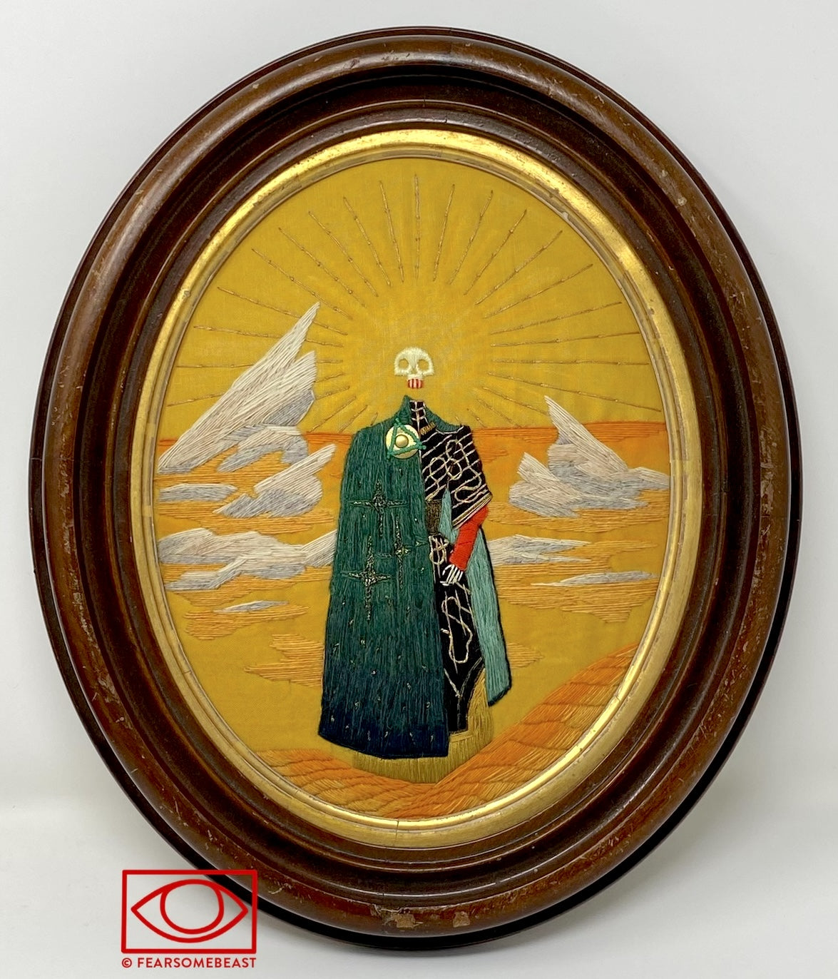 Cotton, wool, and metallic threads. Cotton fabric. Glass beads, metal findings, brass bullion. Color pencil.
